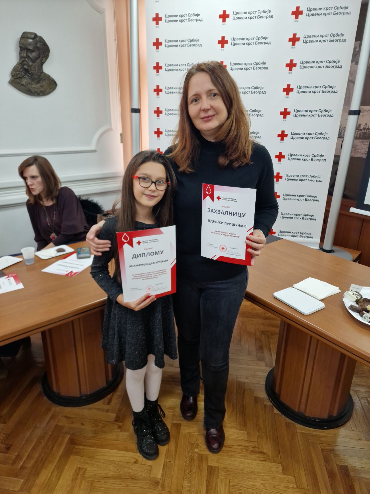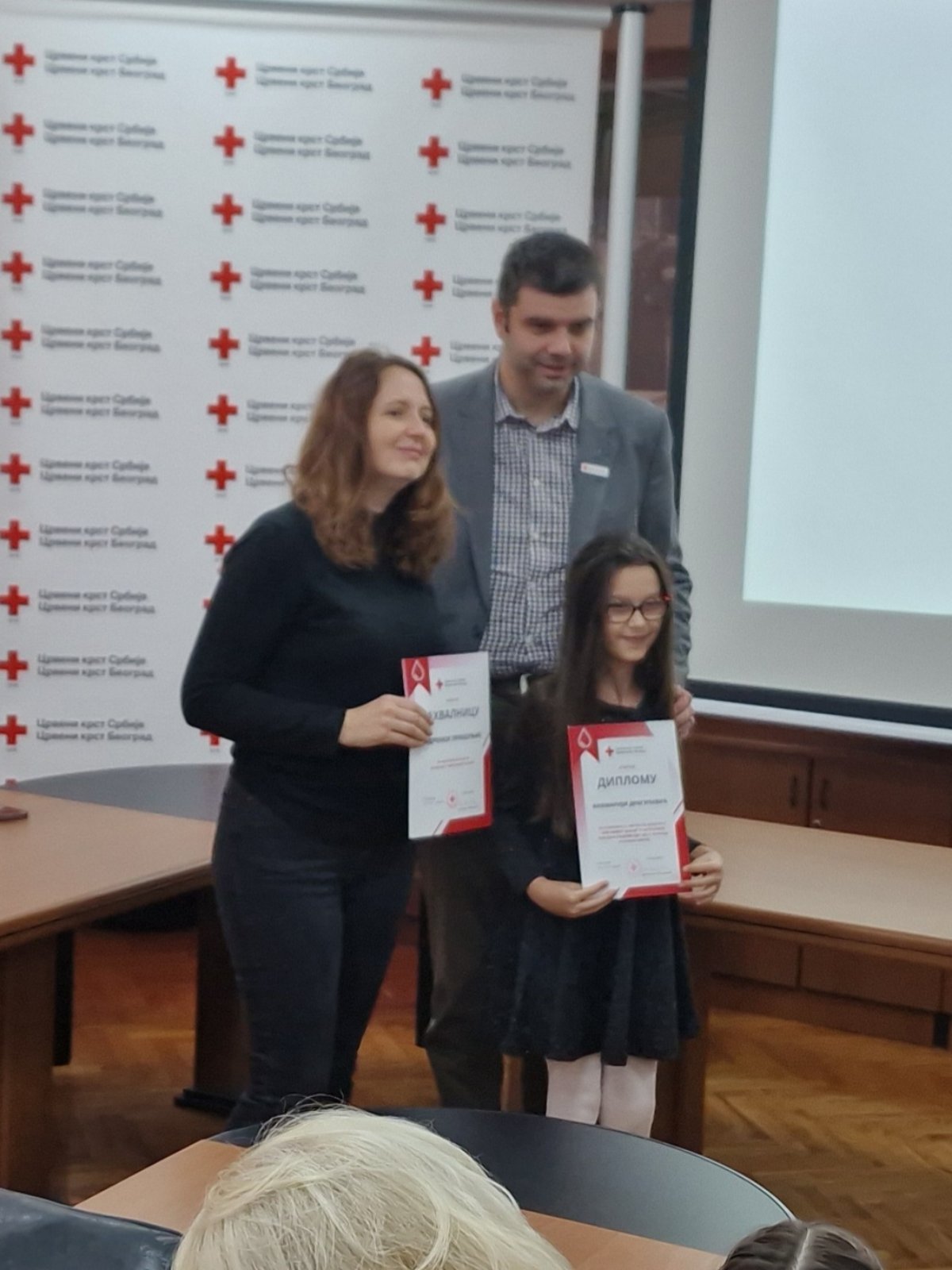 Анамарија Драгићевић, ученица 3-1 одељења наше школе, освојила је друго место на конкурсу "Крв живот значи" у категорији ликовних радова и заједно са својом учитељицом Једренком Пришуњак присуствовала додели награда. Церемонији уручења награда присуствовао је начелник Секретаријата за здравство Слободан Станковић који је финалистима конкурса уручио захвалнице. По речима учитељице од изузетног је значаја развијати код деце од најранијег узраста свест о хуманости, солидарности и важности добровољног давања крви. Велико браво за нашу Анамарију!